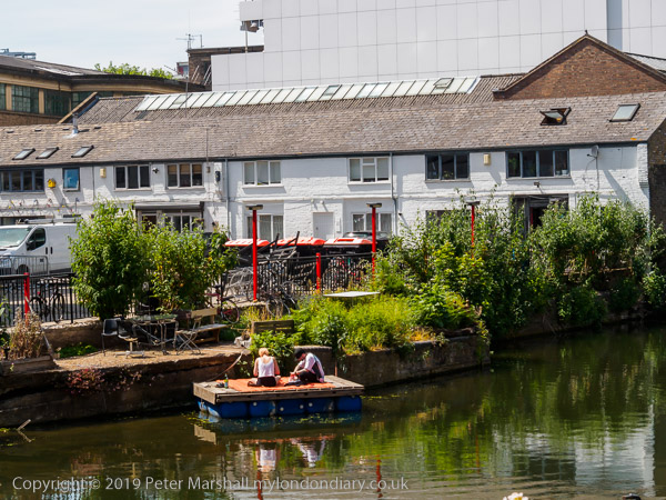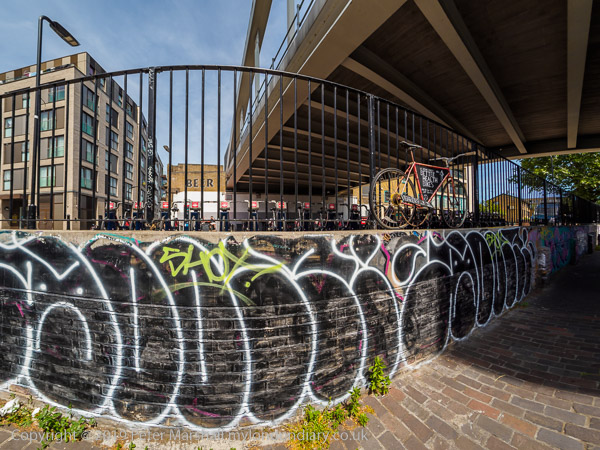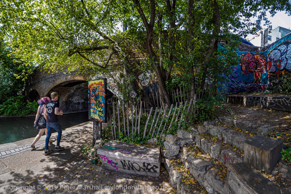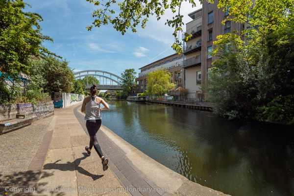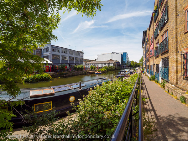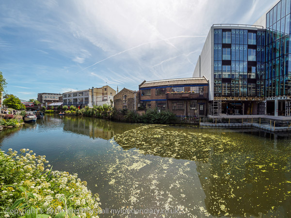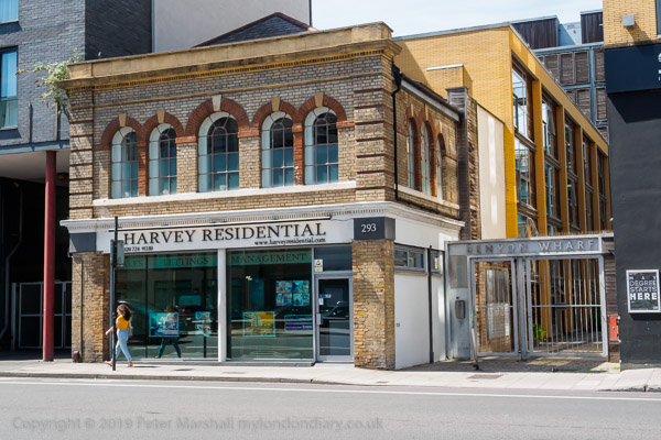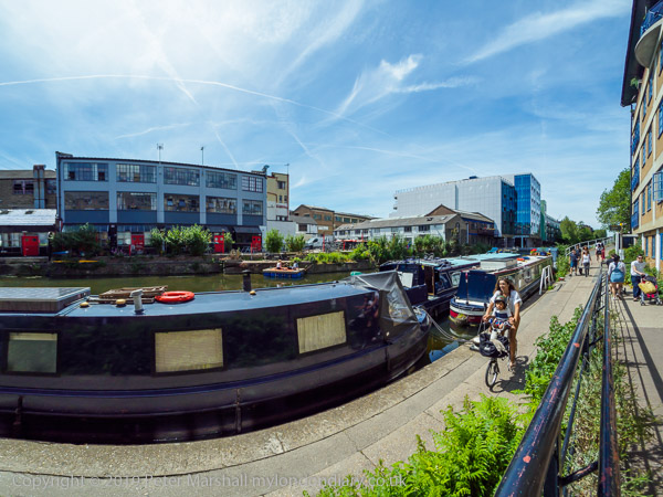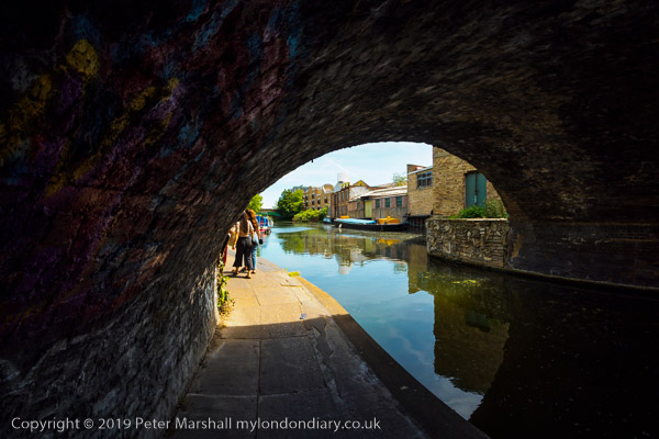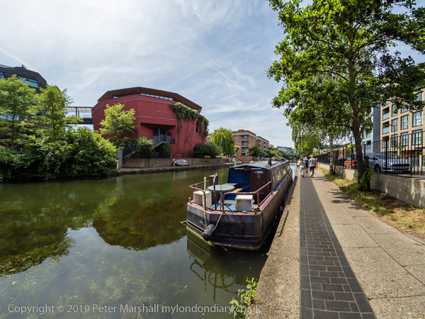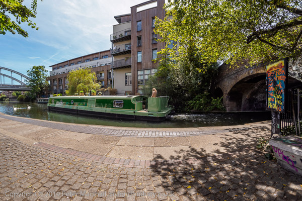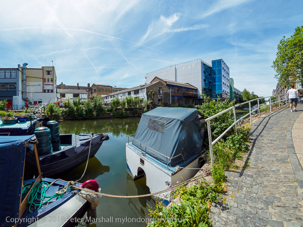 The bridge goes over the entrance to Kingsland Basin - which dates