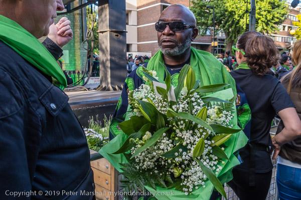 A man holds flowers outside Notting Hill Methodist Church