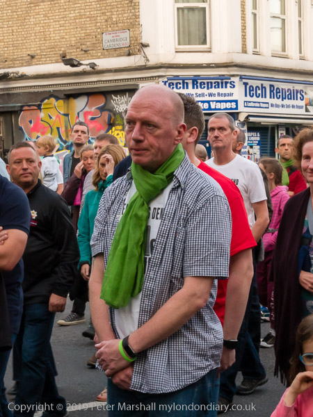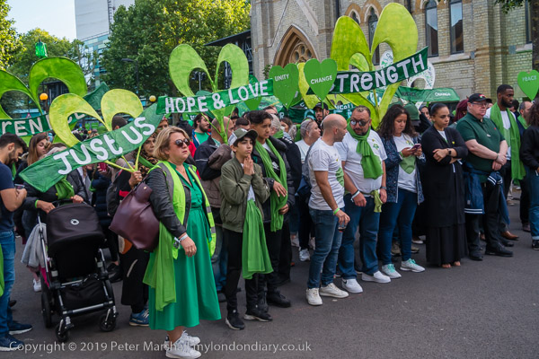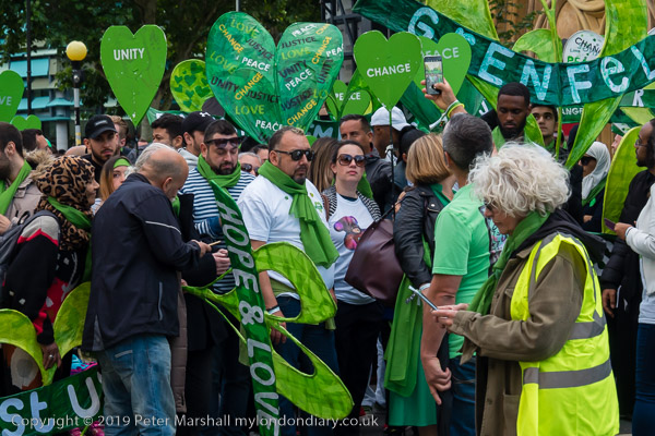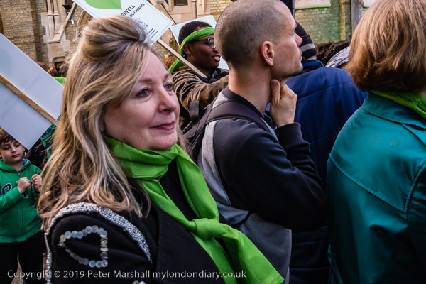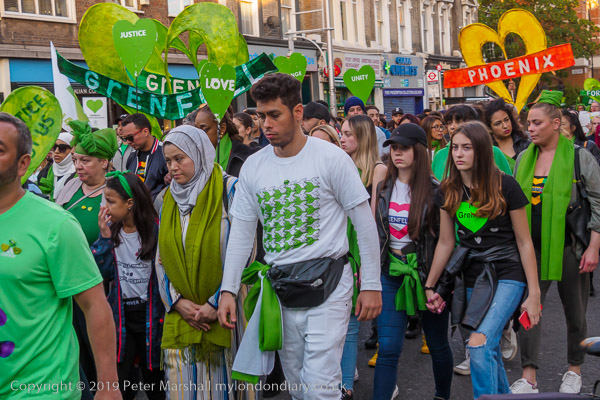 Many marchers wear green scarves and carry green hearts