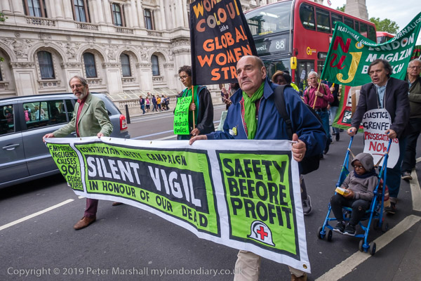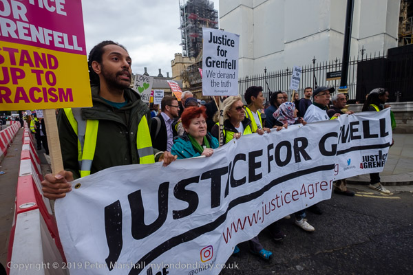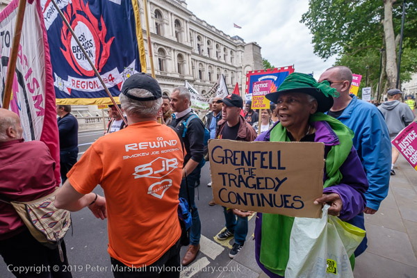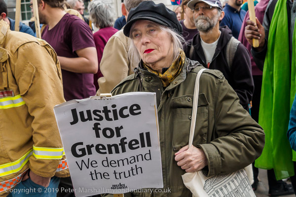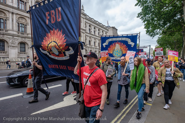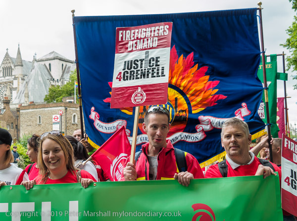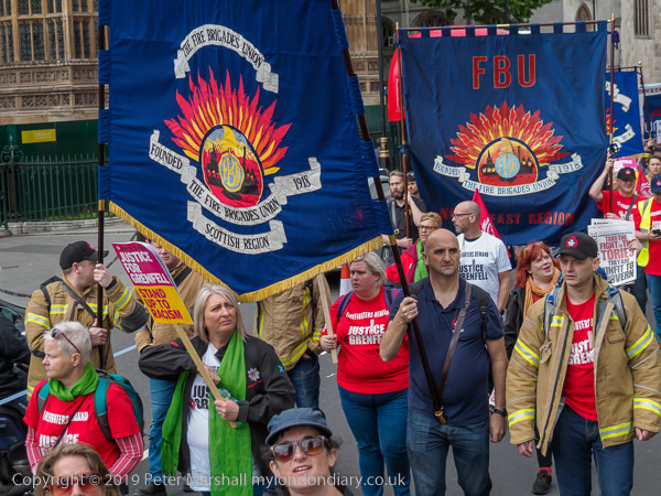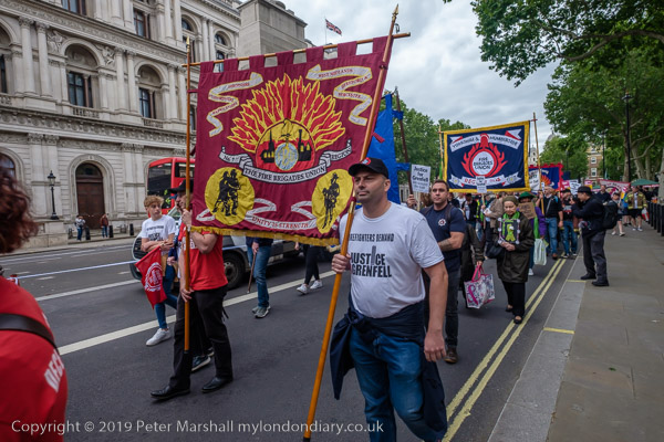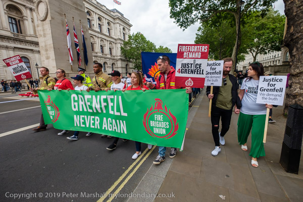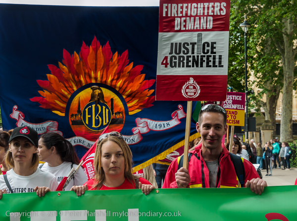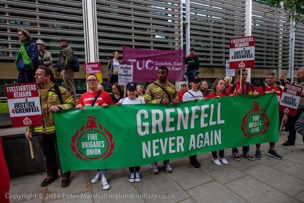 The first of a number of firefighters banners - 'Grenfell Never Again'