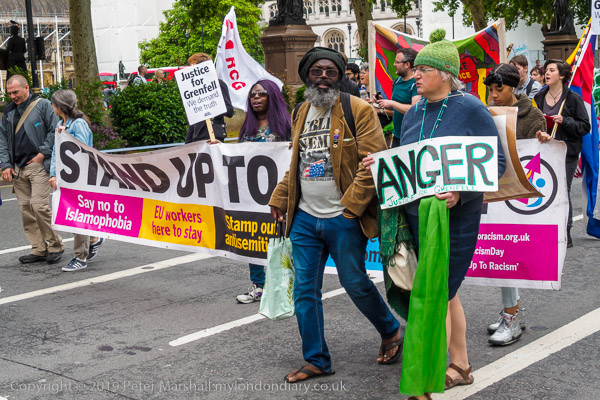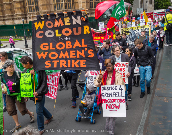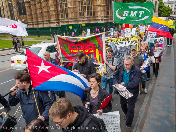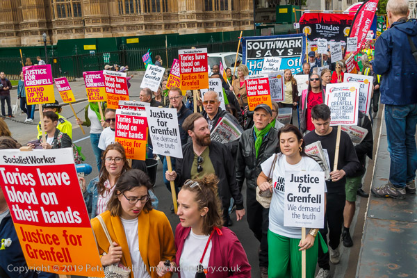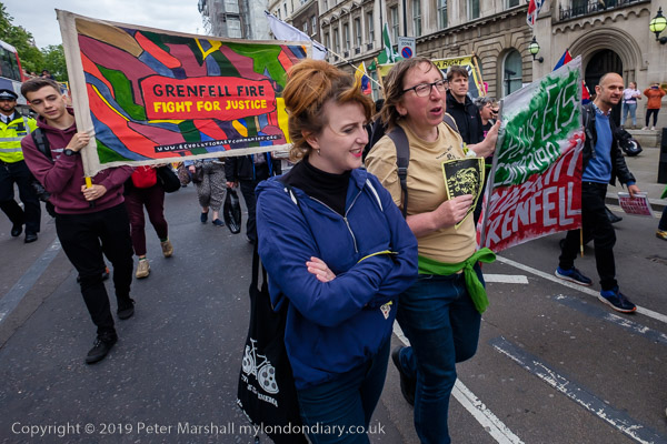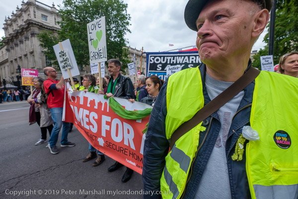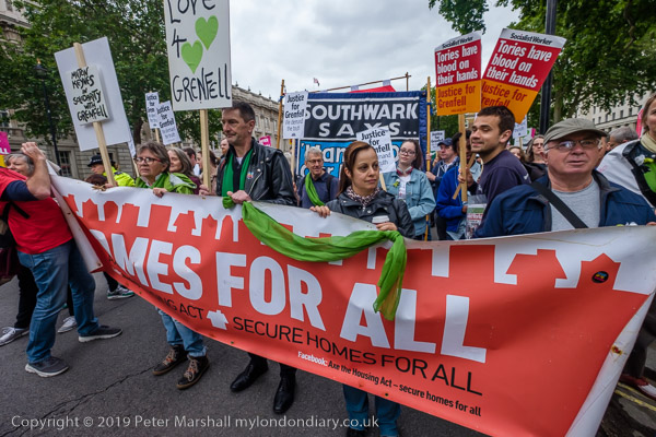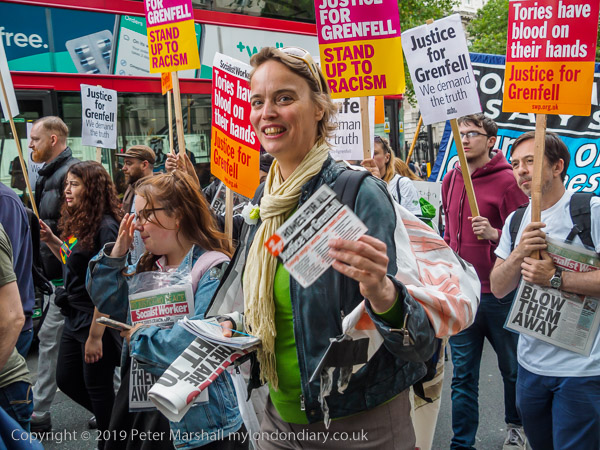 a marcher hands out leaflets - 'Homes for All - Justice for Grenfell'