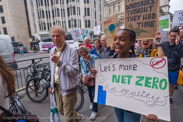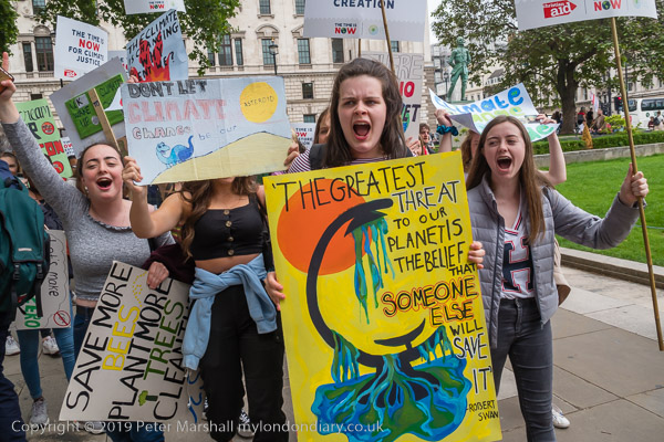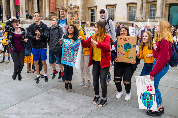 Young protesters jump in the air for a photo in Trafalgar Square