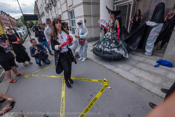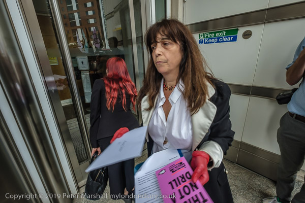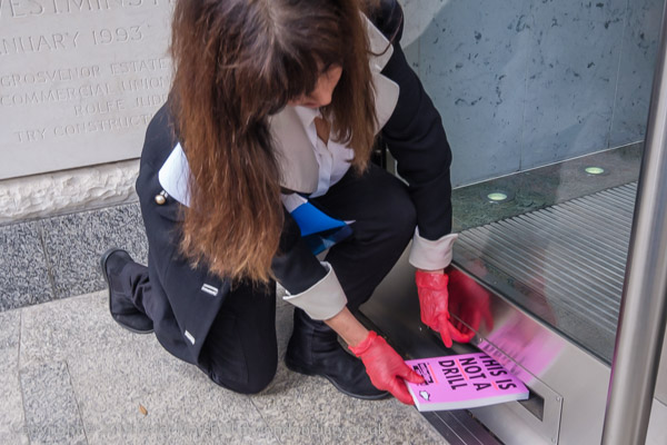 and the protesters shout and raise red hands at the ENI windows