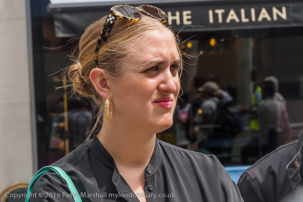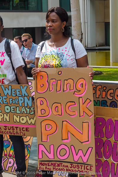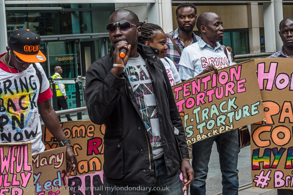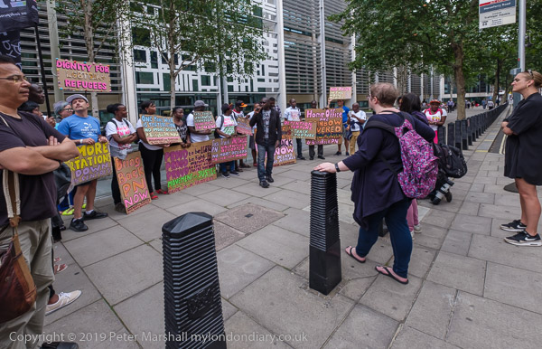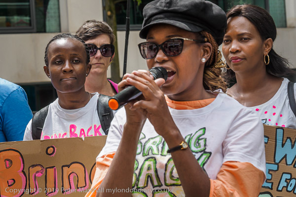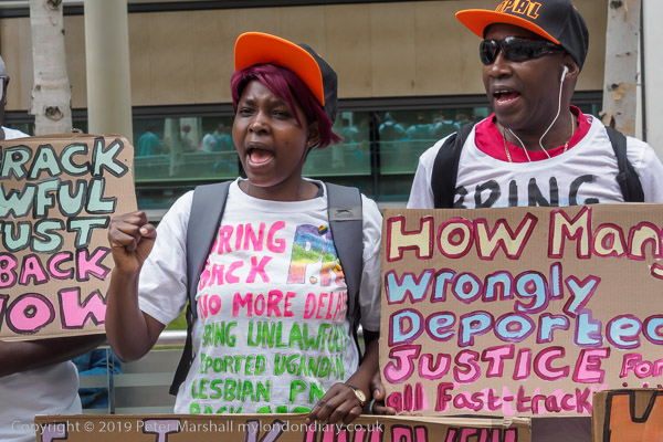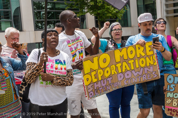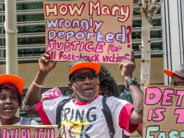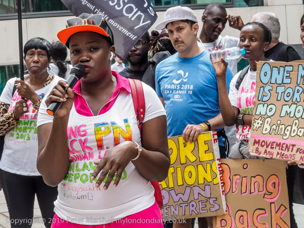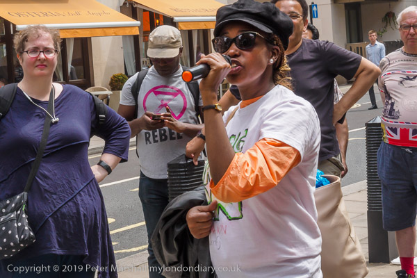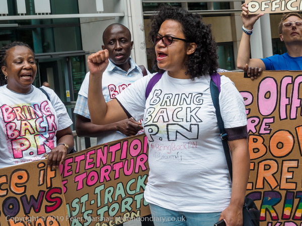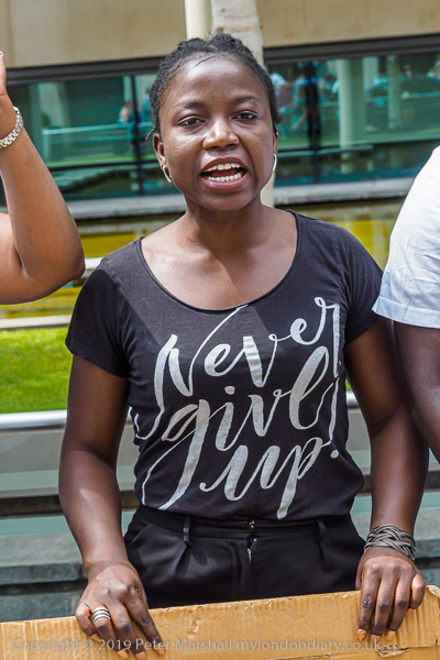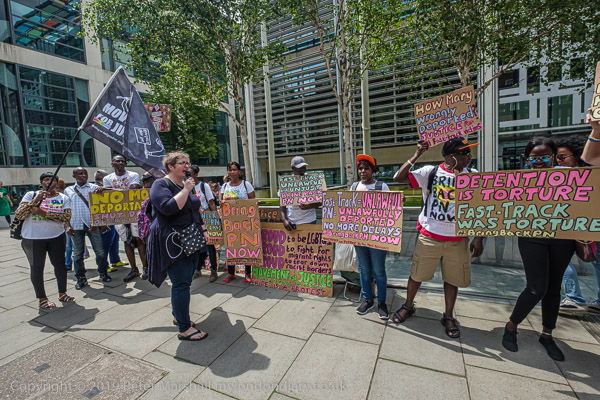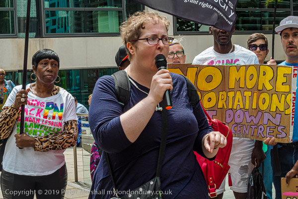 Antonia Bright of MfJ leads some chanting calling the Home Office