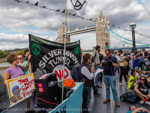 A banner opposes the waste of money on the Silvertown tunnel, which