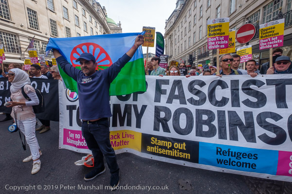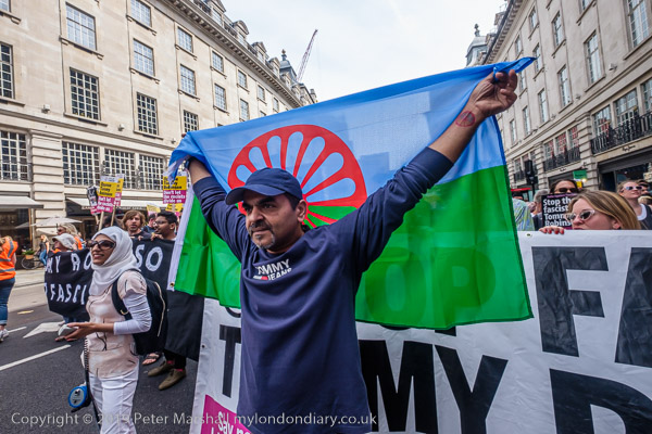 A man holds up the Roma flag - and the banner reads 'Stop Fascist