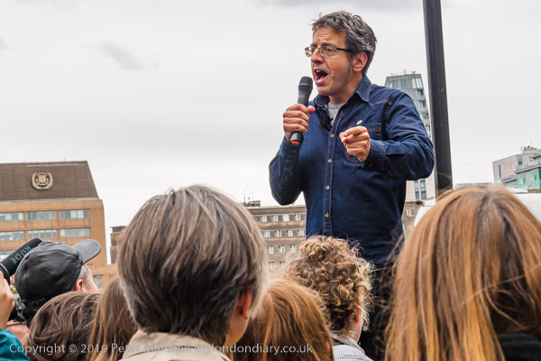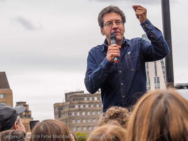 George Monbiot is speaking at the blocked roundabout on Millbank which
