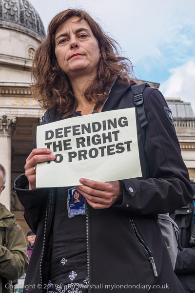 Alexandra Geese holds a poster 'Defending The Right To Protest'