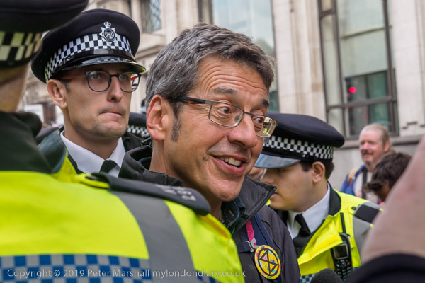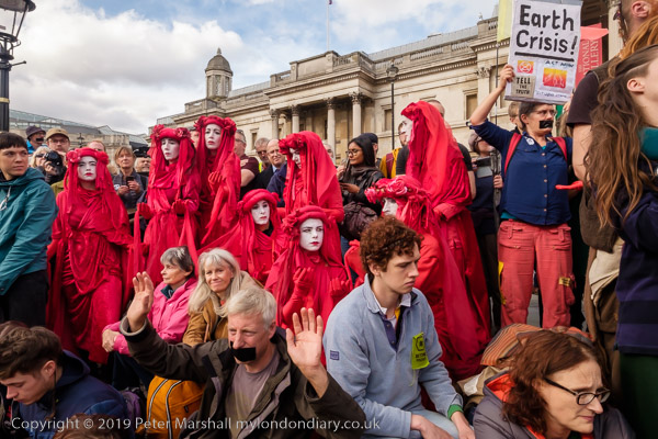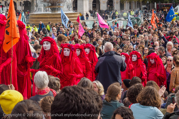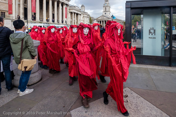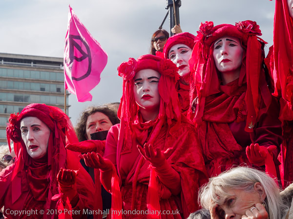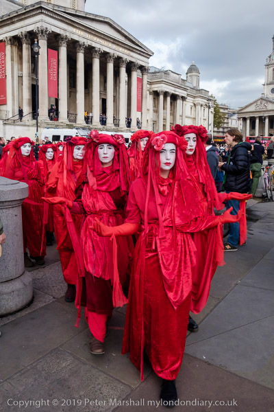 The XR 'Red Brigade' mime troupe make their way through the crowd