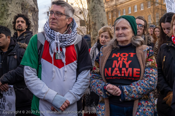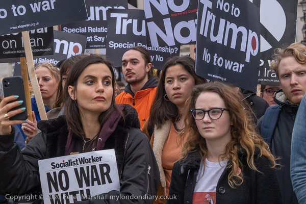 Stop the War and CND rally in Trafalgar Square following President Trump's act of war in ordering the assassination of Iranian general Qassem Soleimani in Baghdad, contravening international law and increasing the risk of a major war in the Middle East.