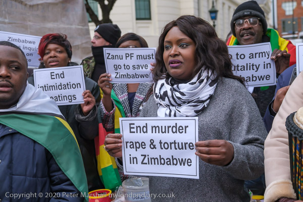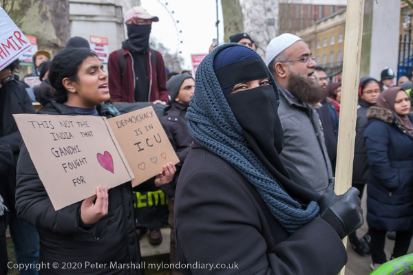 The protesters marched from Downing St up Whitehall and along the Strand to the Indian High Commission where they stood behind a line of barriers filling up the east-bound carriageway. They shouted for an end to violence and for the Act to be annulled as it contravenes the Indian Constitution, the 50th anniversary of which was being celebrated the following day.