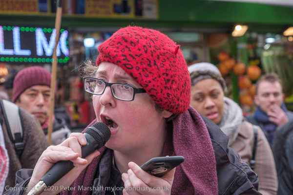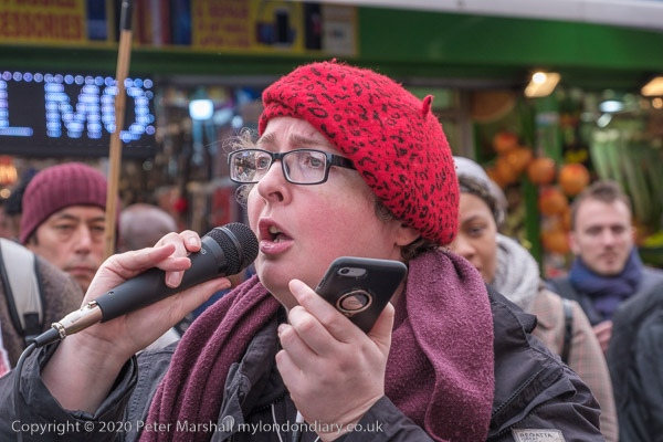 Karen Doyle of MfJ speaks. She holds a phone in her hand and has connected